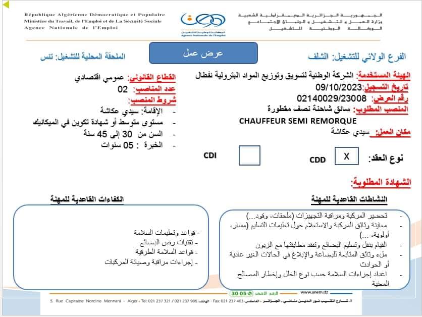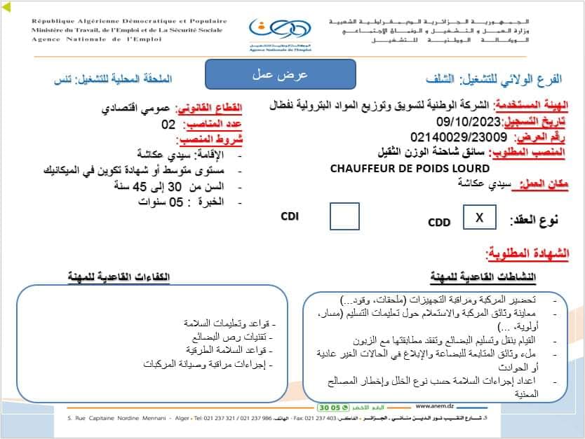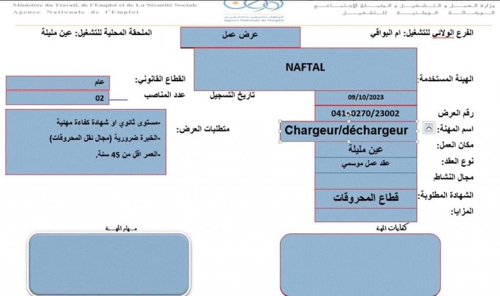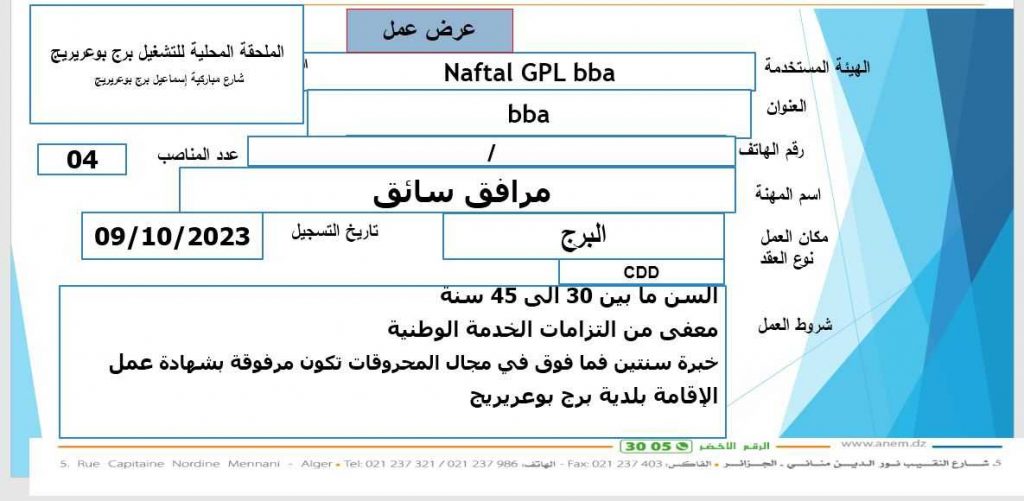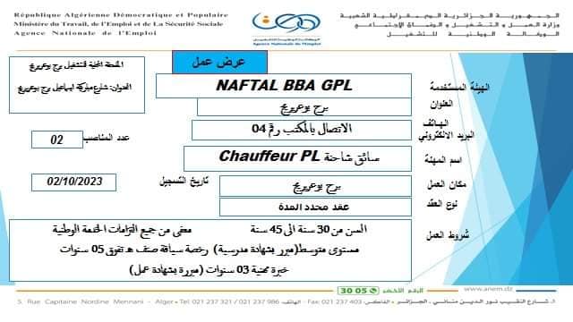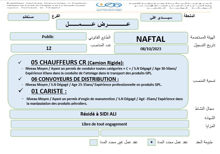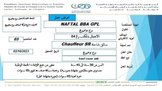 عروض عمل جديدة بشركة نفطال NAFTAL بعدة ولايات (31 منصب) شاركها Facebook Twitter LinkedIn Pinterest عروض عمل جديدة بشركة نفطال NAFTAL بولايات التالية : برج بوعريريج الشلف ام البواقي مستغانم الفرع الولائي للتشغيـل ام البواقي الملحقة المحلية للتشغيل