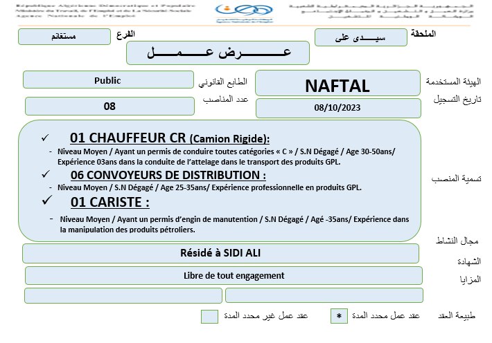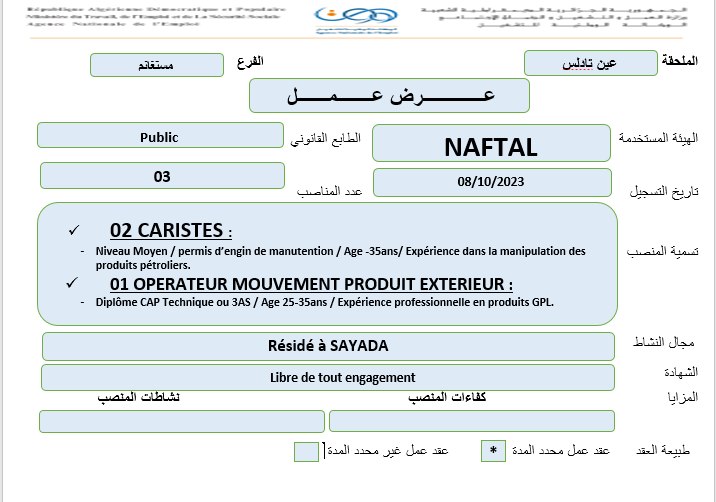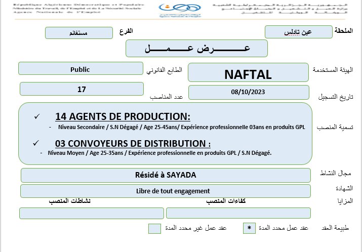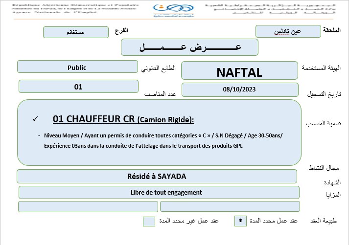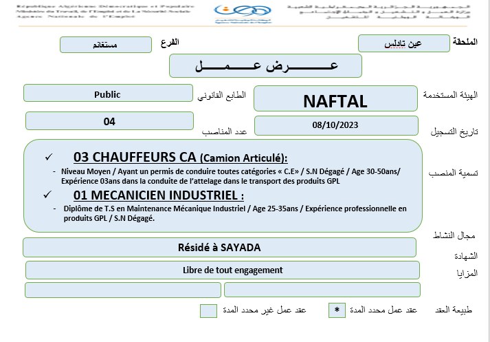 تعلن الملحقة المحلية للتشغيل عين تادلس عن عرض عمل بشركة نفطال NAFTAL كما هو موضح ادناه