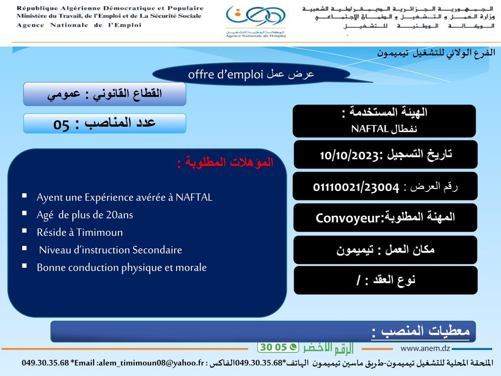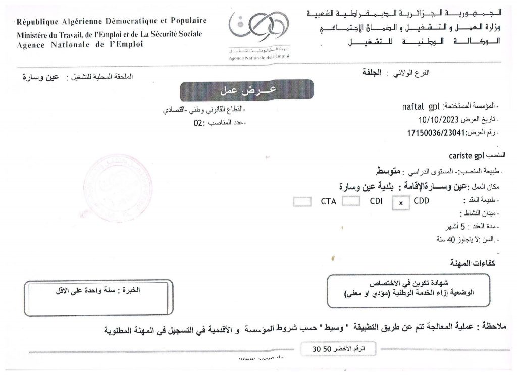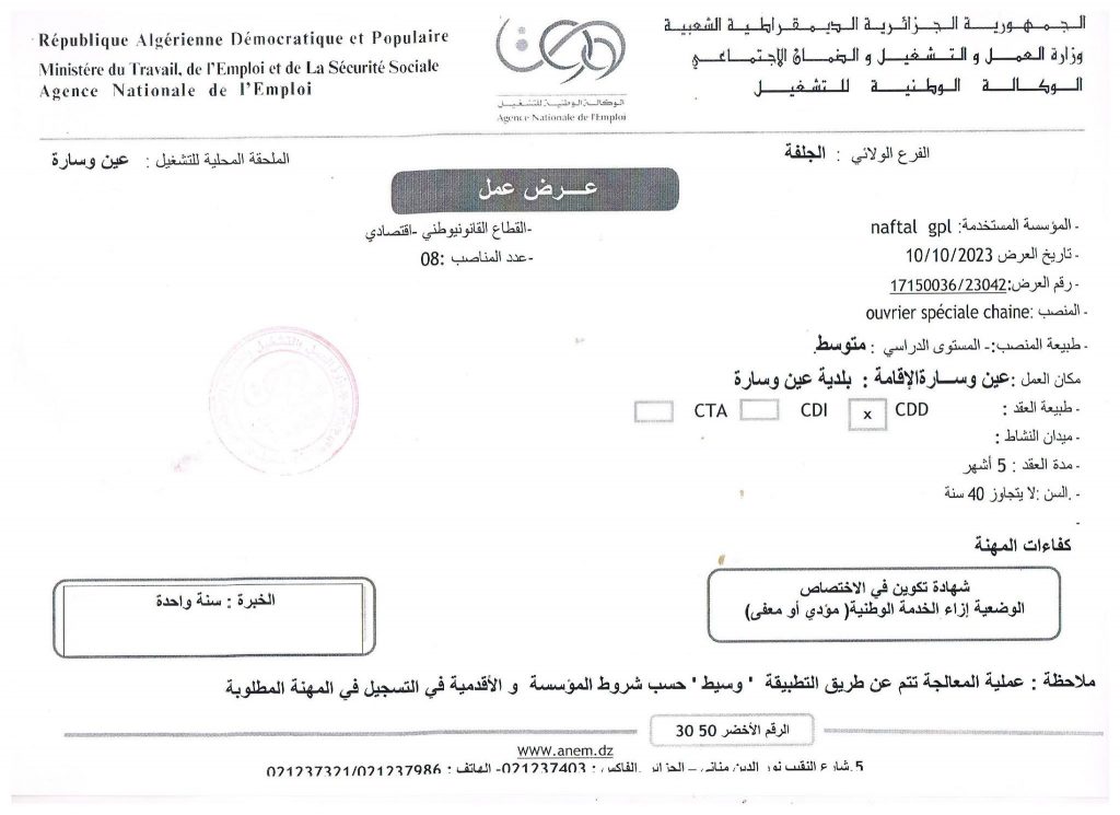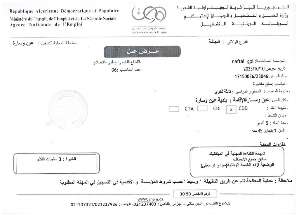 عروض عمل جديدة بشركة نفطال NAFTAL (35 منصب) شاركها Facebook Twitter LinkedIn Pinterest عروض عمل جديدة بشركة نفطال NAFTAL بولايات التالية : الجلفة تيميمون الفرع الولائي للتشغيـل الجلفة الملحقة المحلية للتشغيل