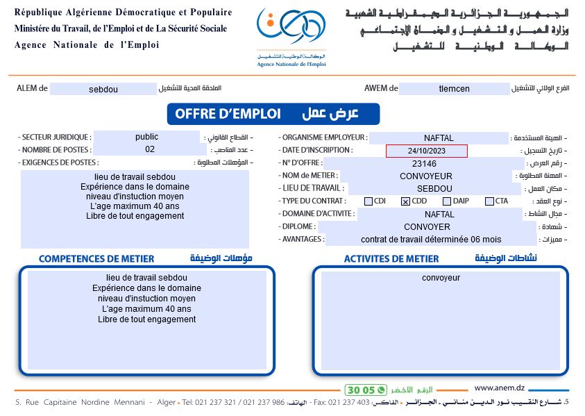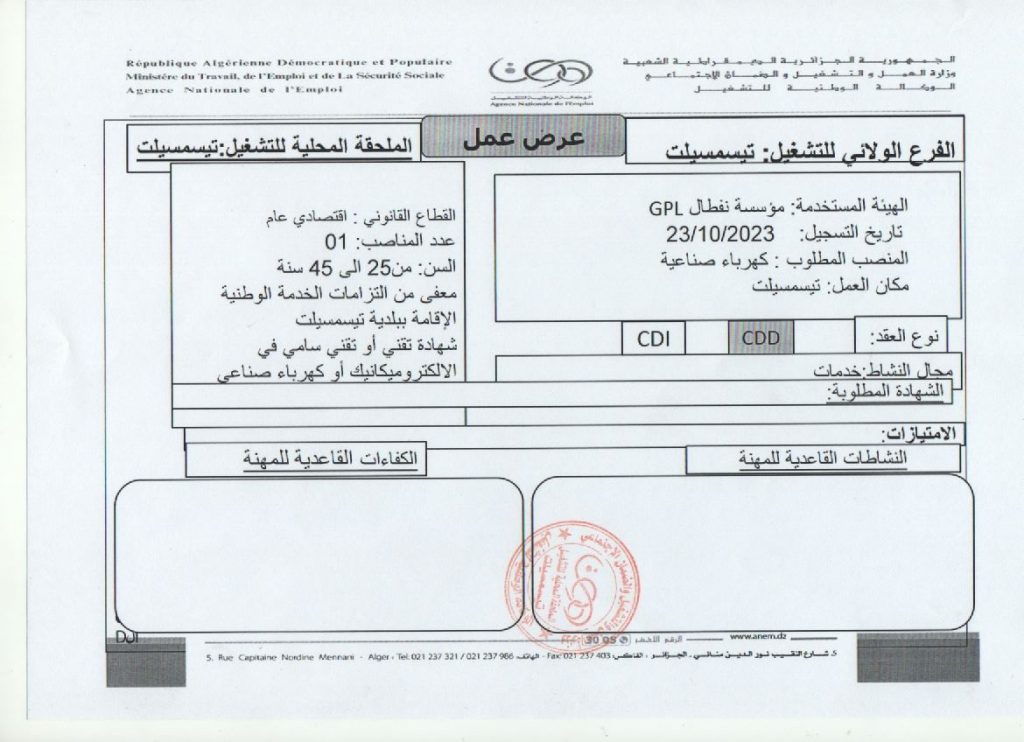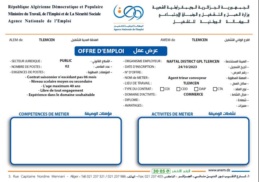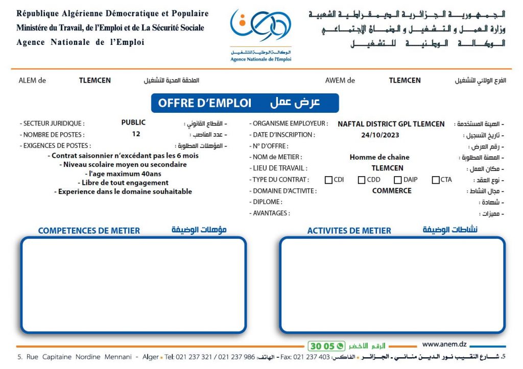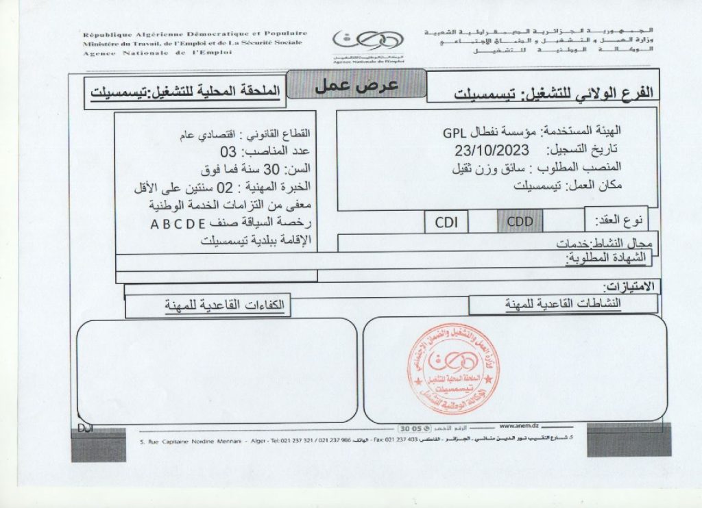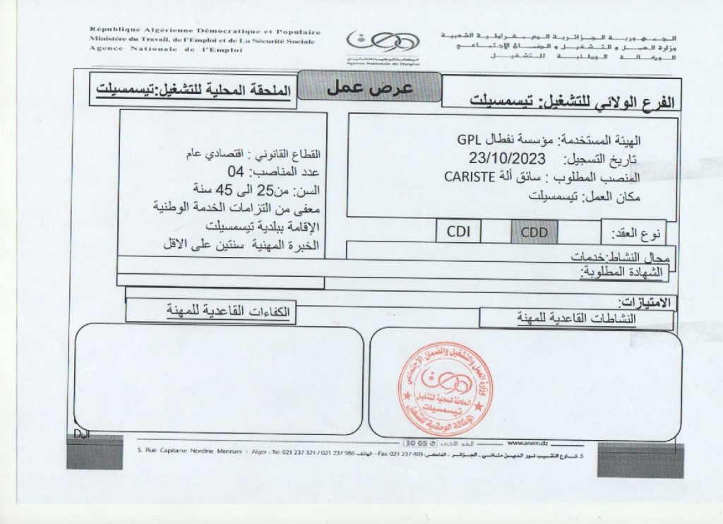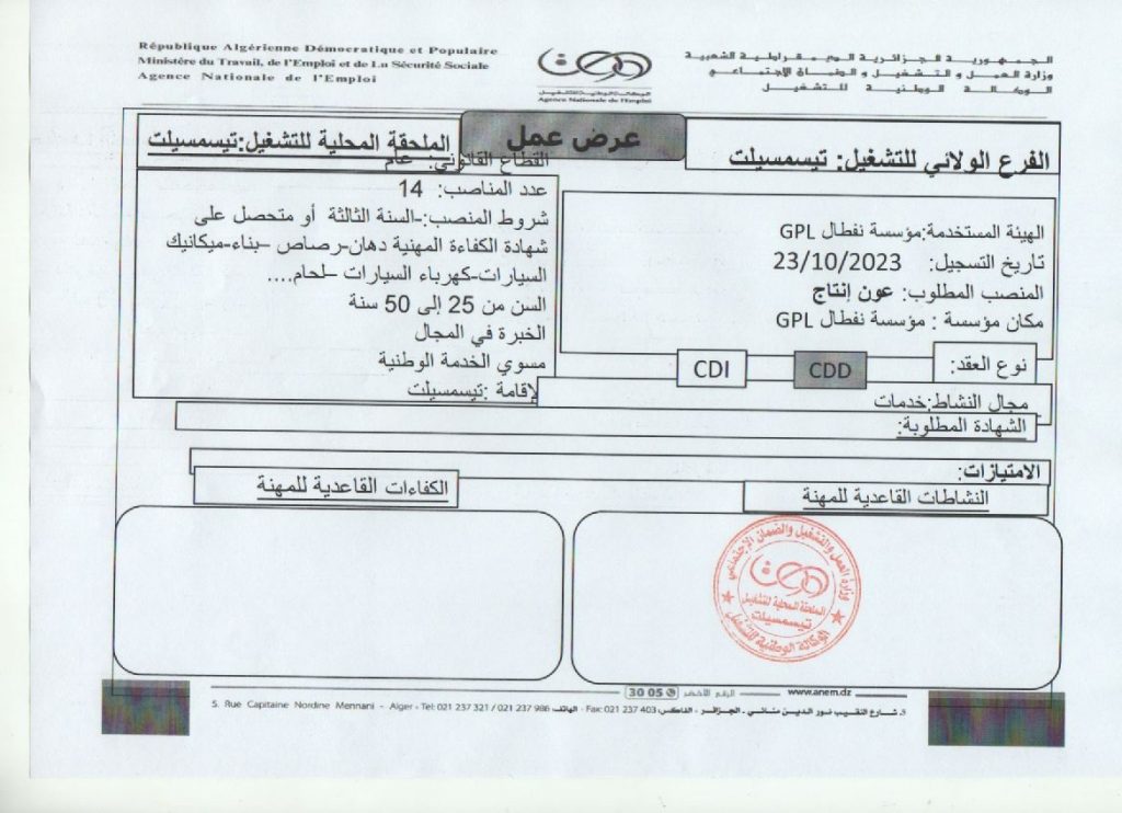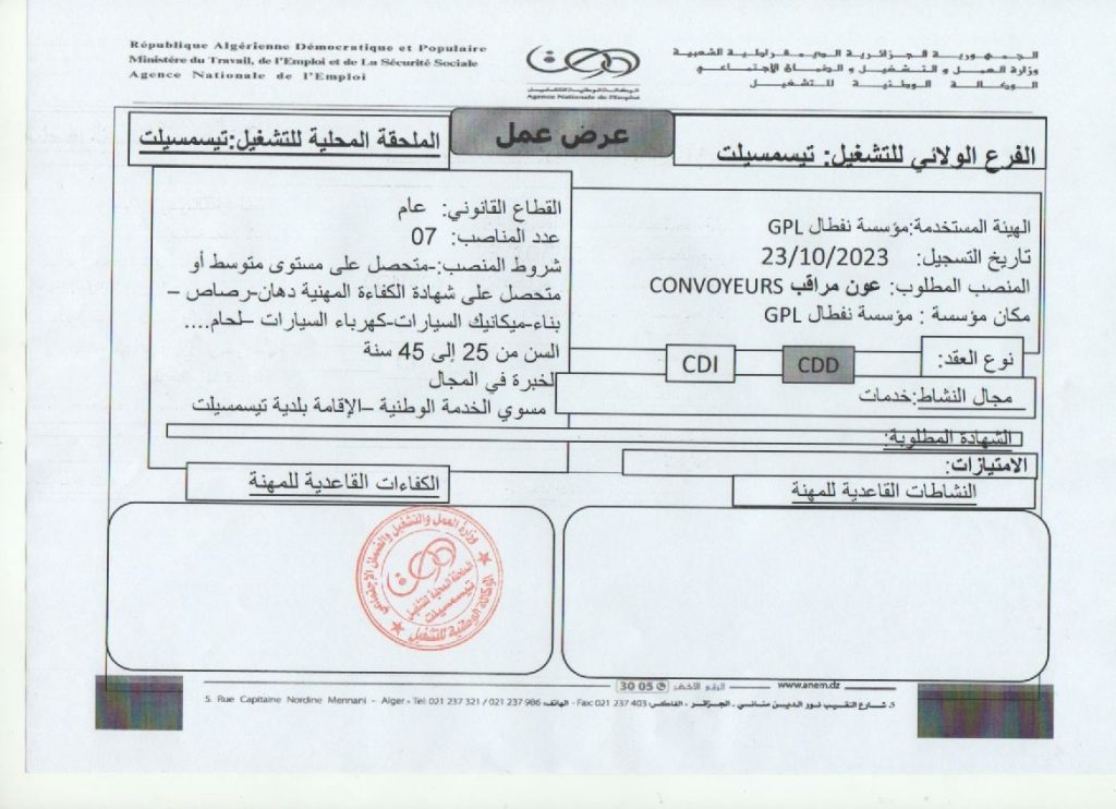 عروض عمل جديدة بمؤسسة نفطال NAFTAL GPL (45 منصب) شاركها Facebook Twitter LinkedIn Pinterest عروض عمل جديدة بمؤسسة نفطال NAFTAL GPL بولايتي: تيسمسيلت وتلمسان الفرع الولائي للتشغيـل تيسمسيلت الملحقة المحلية للتشغيل