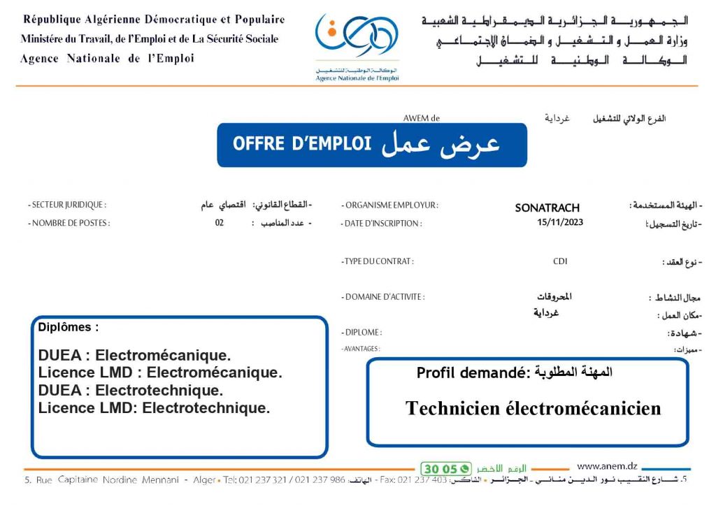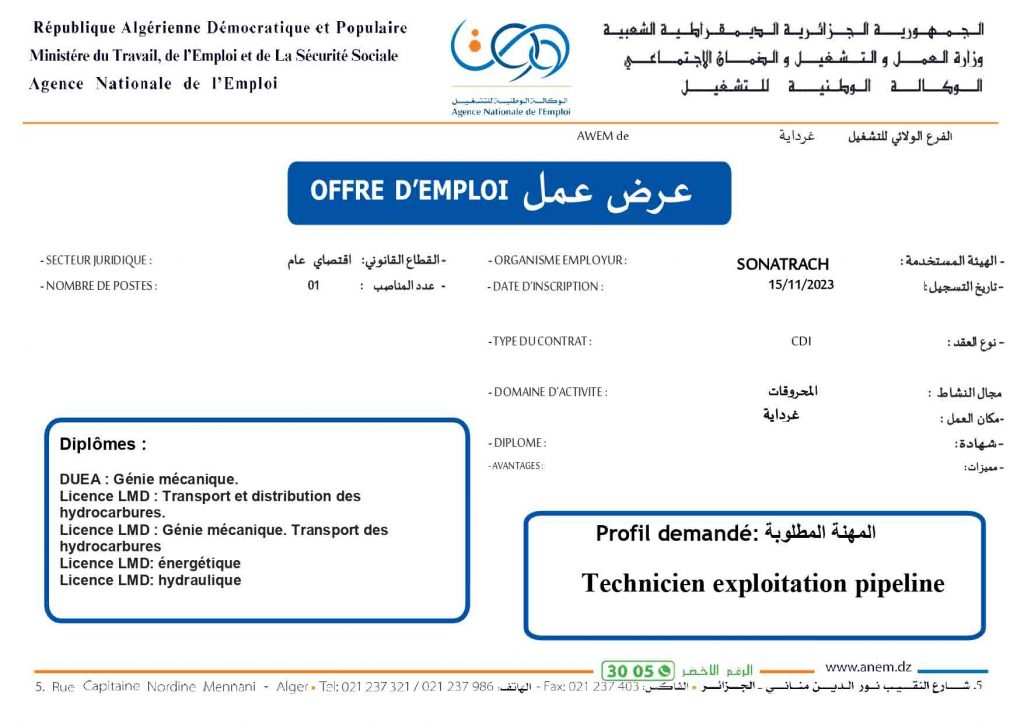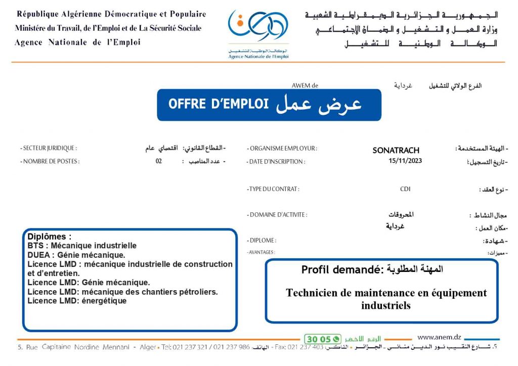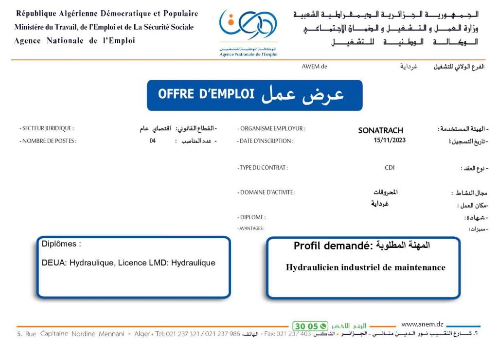عروض عمل جديدة خاص بشركة سوناطراك Sonatrach (22 منصب) شاركها Facebook Twitter LinkedIn Pinterest الفرع الولائي للتشغيـل