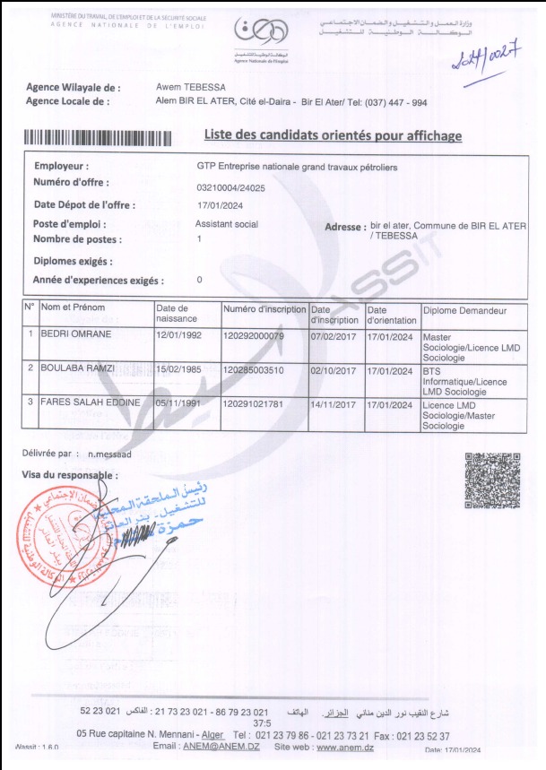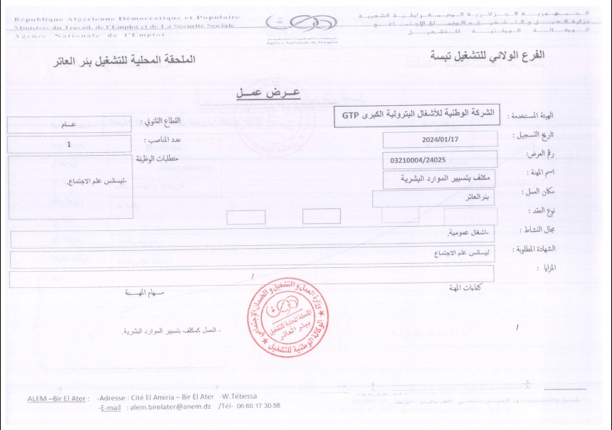 عروض عمل (جديد) بالمؤسسة الوطنية للأشفال البترولية الكبرى GTP شاركها Facebook Twitter LinkedIn Pinterest الفرع الولائي للتشغيـل تبسة الملحقة المحلية للتشغيل