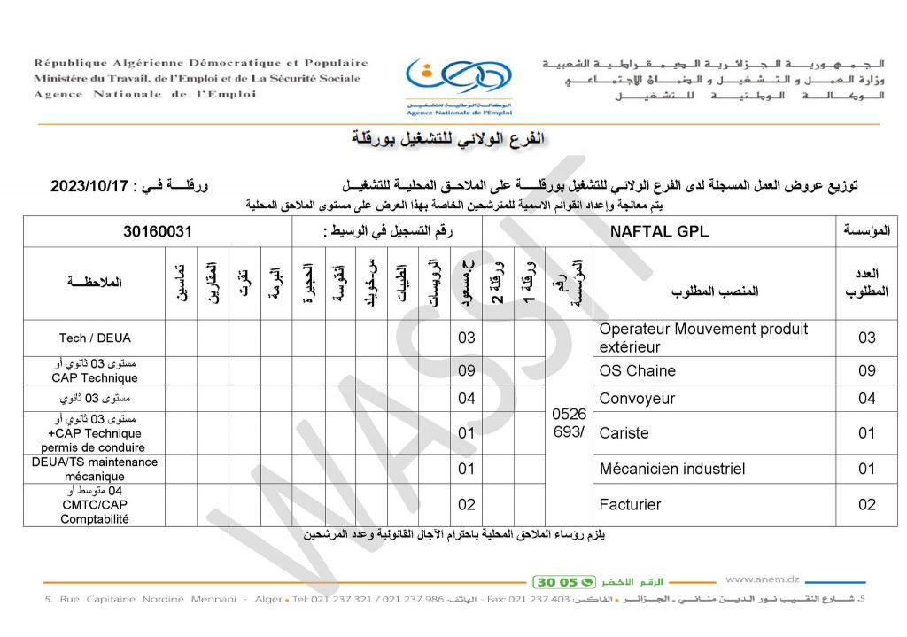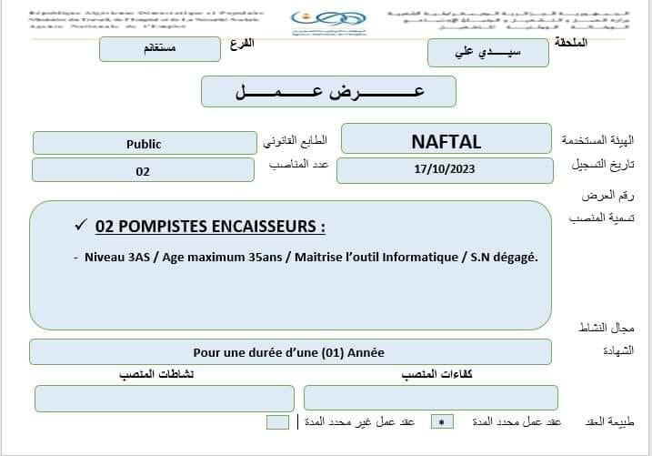 تعلن الملحقة المحلية للتشغيل سيدي علي عن عرض عمل بمؤسسة نفطال NAFTAL كما هو موضح ادناه