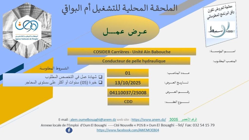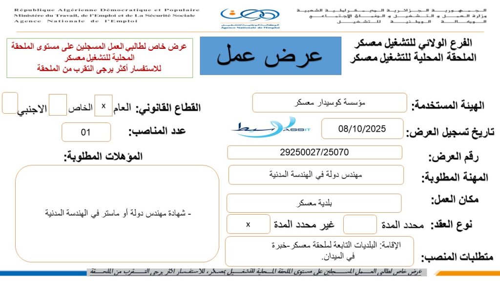 عرض خاص لطالبي العمل المسجلين على مستوى الملحقة المحلية للتشغيل معسكر، للإستفسار أكثر يرجى التقرب من الملحقة.