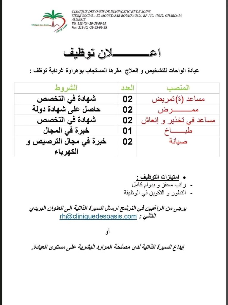 عيادة الواحات للتشخيص و العلاج مقرها المستجاب بوهراوة غرداية توظف :