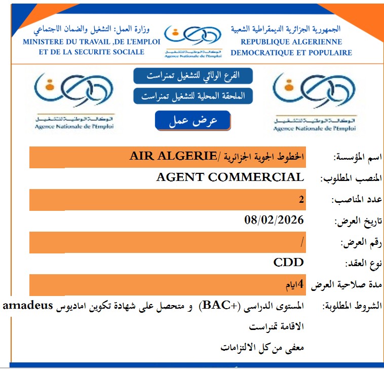 الشروط المطلوبة: * المستوى الدراسي (BAC +) و متحصل على شهادة تكوين اماديوس amadeus