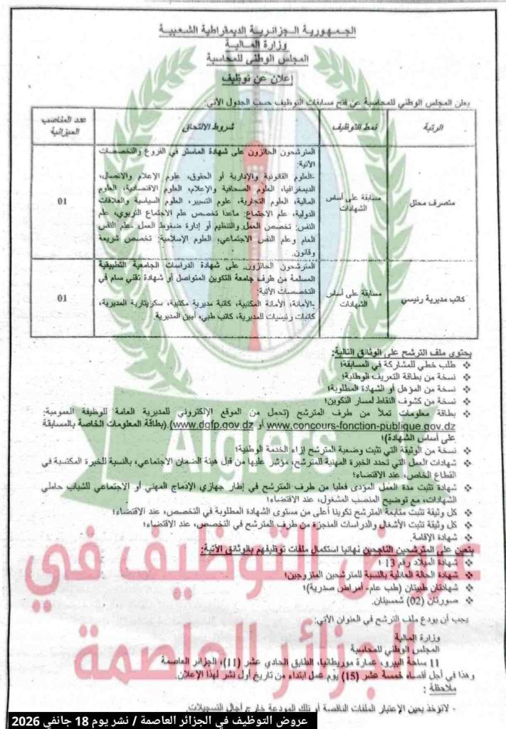 يعلن المجلس الوطني للمحاسبة عن فتح مسابقات التوظيف حسب الجدول الآتي: