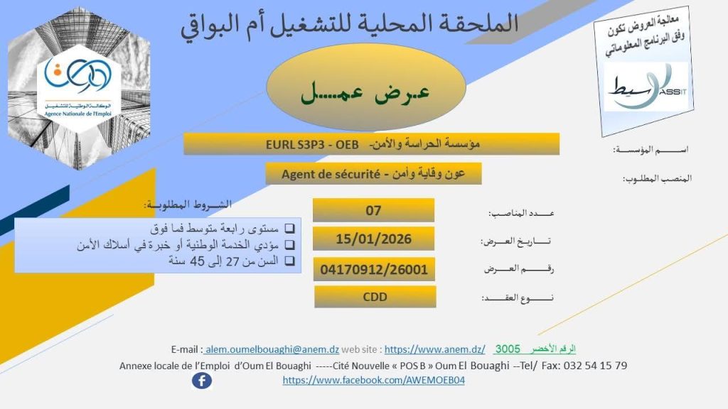 اسم المؤسسة: مؤسسة الحراسة والأمن – EURL S3P3 – OEB