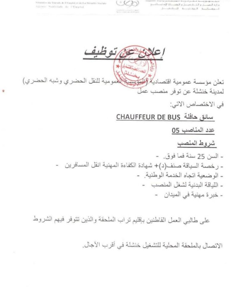 تعلن مؤسسة عمومية اقتصادية عمومية للنقل الحضري وشبه الحضري لمدينة خنشلة عن توفر منصب عمل في الاختصاص الآتي: