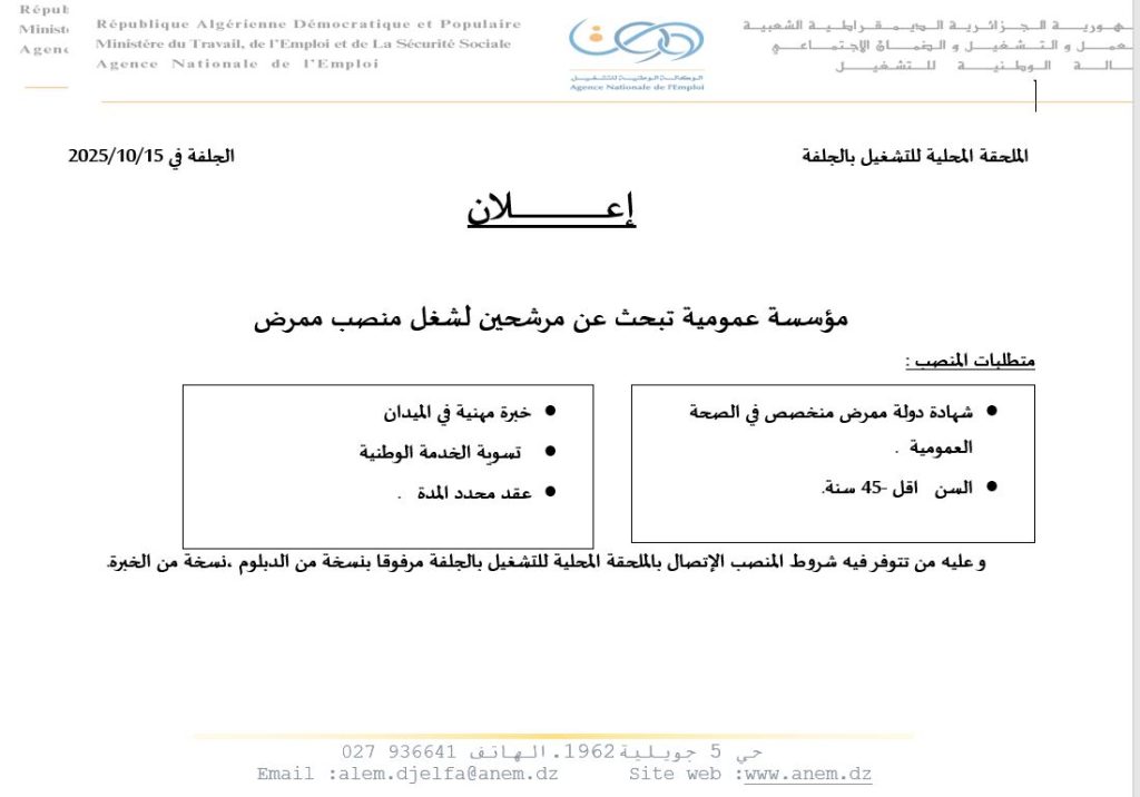 وعليه من تتوفر فيه شروط المنصب الإتصال بالملحقة المحلية للتشغيل بالجلفة مرفوقا بنسخة من الدبلوم، نسخة من الخبرة.