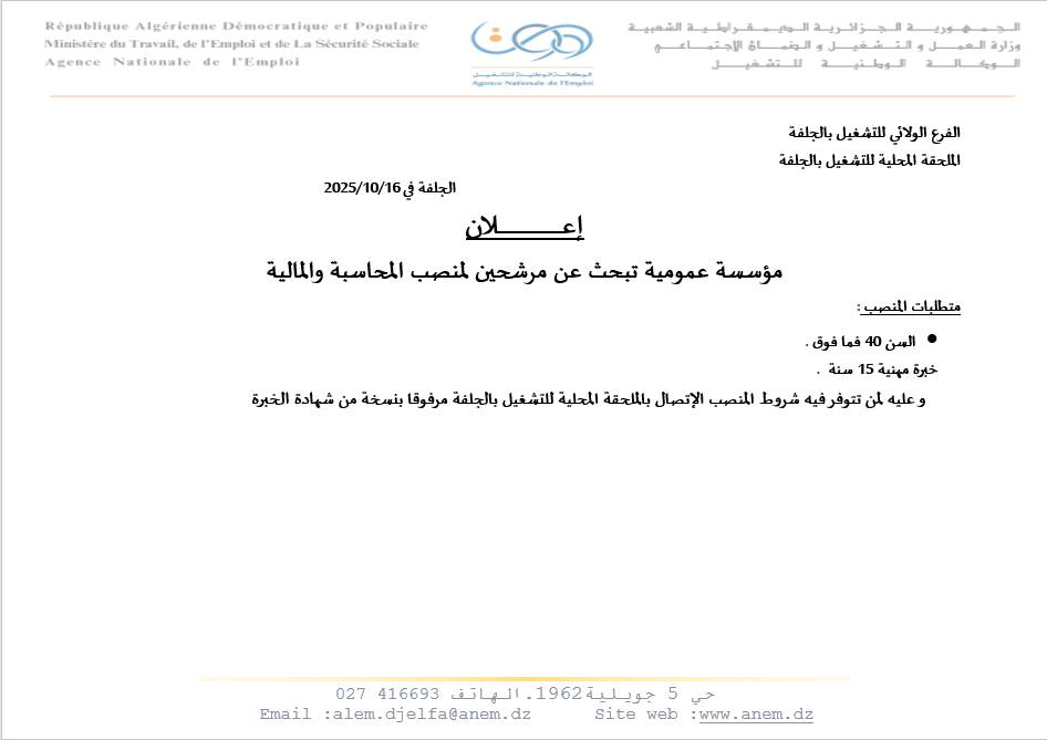 وعليه لمن تتوفر فيه شروط المنصب الإتصال بالملحقة المحلية للتشغيل بالجلفة مرفوقا بنسخة من شهادة الخبرة.