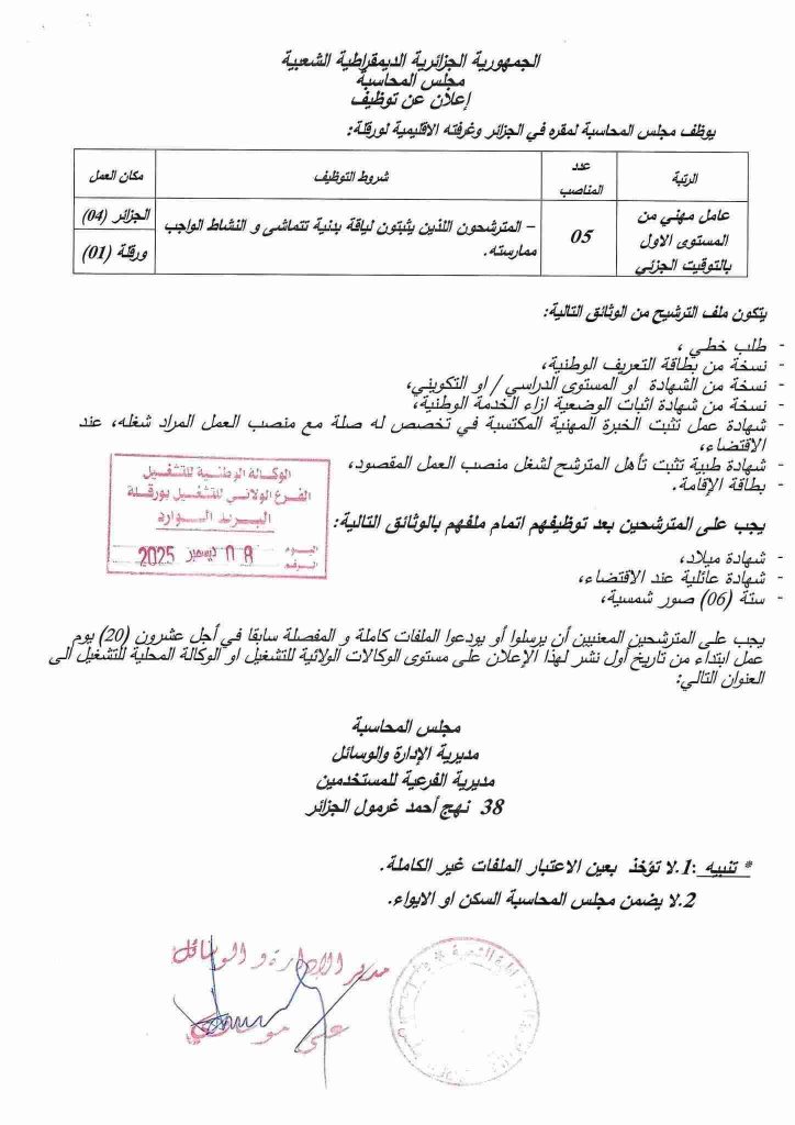يوظف مجلس المحاسبة لمقره في الجزائر وغرفته الإقليمية لورقلة: