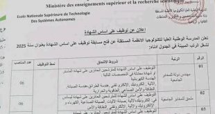 وزارة التعليم العالي و البحث العلمي ads المدرسة الوطنية العليا للتكنولوجيا الأنظمة المستقلة إعلان عن توظيف على أساس الشهادة تعلن المدرسة الوطنية العليا للتكنولوجيا الأنظمة المستقلة عن فتح مسابقة توظيف على أساس الشهادة بعنوان سنة 2025 لشغل الرتب المبينة في الجدول أدناه: مديرية التربية …
