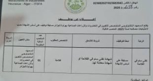 إعلان ads مؤسسة عمومية تبحث لاحتياجاتها عن: Grutiers sur Chenille gros Tonnage فعلى الراغبين العمل بهذه المؤسسة ويملكون خبرة 05 سنوات على الأقل والقاطنين ببلدية بهار وما جاورها الاتصال بالملحقة المحلية للتشغيل بالبيرين. مديرية التربية تفتح مسابقة توظيف العمال المهنيين 180 منصب سوناطراك توظف …