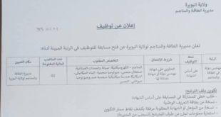 مديرية الطاقة والمناجم ولاية البويرة ads إعلان عن توظيف تعلن مديرية الطاقة والمناجم لولاية البويرة عن فتح مسابقة للتوظيف في الرتبة المبينة أدناه: الرتبةنمط التوظيفشروط الالتحاقالتخصص المطلوبعدد المناصب المالية المفتوحةمكان التعيينمهندس دولة في الطاقة والمناجمعلى أساس الشهادةالحائزين على شهادة مهندس دولة أو شهادة معادلة …