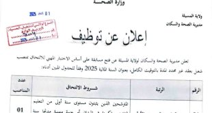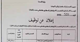 وزارة الصحة مديرية الصحة والسكان لولاية الجلفة المؤسسة الاستشفائية المتخصصة للأم والطفل الدكتور كاكي محمد بالجلفة ads إعــلان عـن تـوظـيف تعلن المؤسسة الاستشفائية المتخصصة للأم والطفل الدكتور كاكاي محمد بالجلفة عن فتح مسابقات التوظيف في الرتب التالية: الرتبةنمط التوظيفشروط الالتحاقالتخصص المطلوبعدد المناصب المفتوحةمكان العملطبيب …