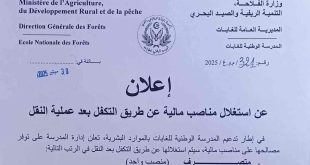 وزارة الفلاحة التنمية الريفية والصيد البحري المديرية العامة للغابات المدرسة الوطنية للغابات ads باتنة في: 30 سبتمبر 2025 إعــلان عن إستغلال مناصب مالية عن طريق التكفل بعد عملية النقل في إطار تدعيم المدرسة الوطنية للغابات بالموارد البشرية، تعلن إدارة المدرسة عن توفر مصالحها على …