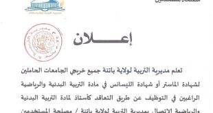 وزارة التربية الوطنية مديرية التربية لولاية باتنة مصلحة المستخدمين ads إعلان تعلن مديرية التربية لولاية باتنة جميع خريجي الجامعات الحاملين لشهادة الماستر أو شهادة الليسانس في مادة التربية البدنية والرياضية الراغبين في التوظيف عن طريق التعاقد كأساتذة لمادة التربية البدنية والرياضية الاتصال بمديرية التربية …