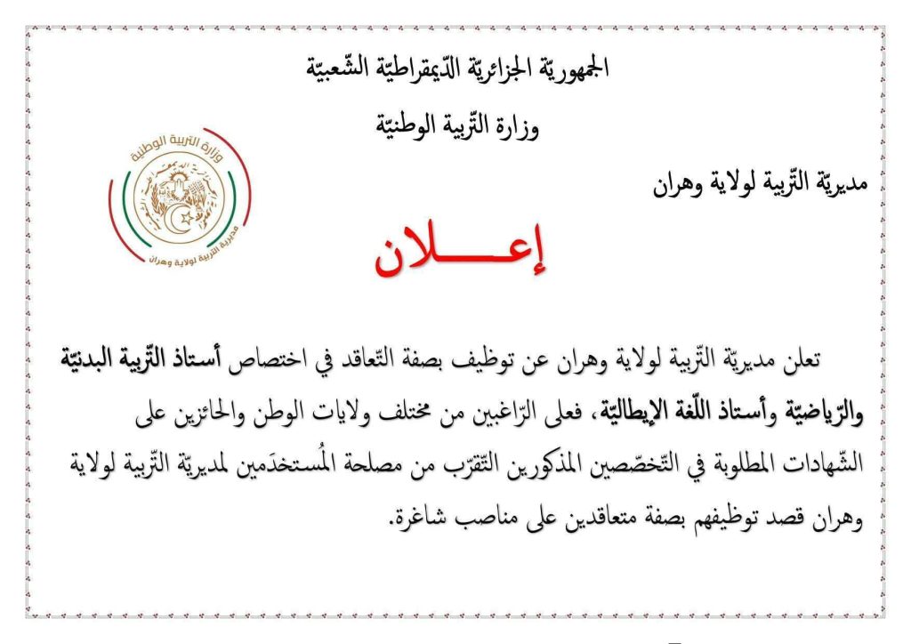 تعلن مديرية التربية لولاية وهران عن توظيف بصفة التعاقد في اختصاص أستاذ التربية البدنية والرياضية وأستاذ اللغة الإيطالية، فعلى الراغبين من مختلف ولايات الوطن والحائزين على الشهادات المطلوبة في التخصصين المذكورين التقرب من مصلحة المستخدمين بمديرية التربية لولاية وهران قصد توظيفهم بصفة متعاقدين على مناصب شاغرة.