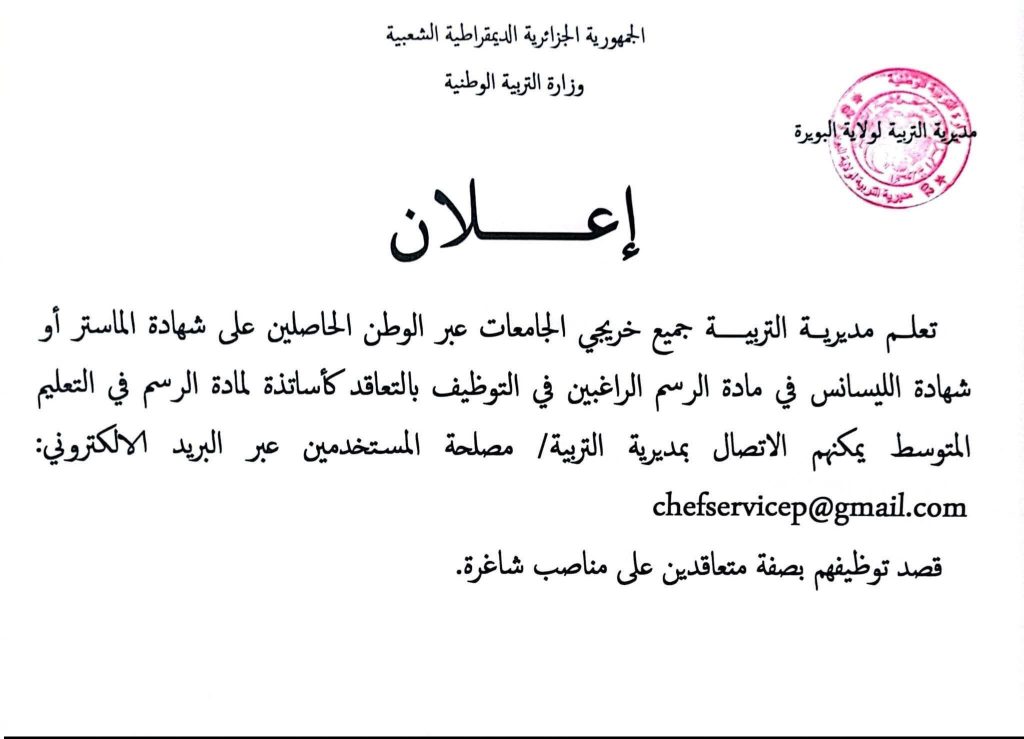 تعلـم مديرية التربية جميع خريجي الجامعات عبر الوطن الحاصلين على شهادة الماسـتر أو شـهادة الليسانس في مادة الرسم الراغبين في التوظيف بالتعاقد كأساتذة لمادة الرسم في التعليم الـمتوسط يمكنهم الاتصال بمديرية التربية/ مصلحة المستخدمين عبر البريد الالكتروني: