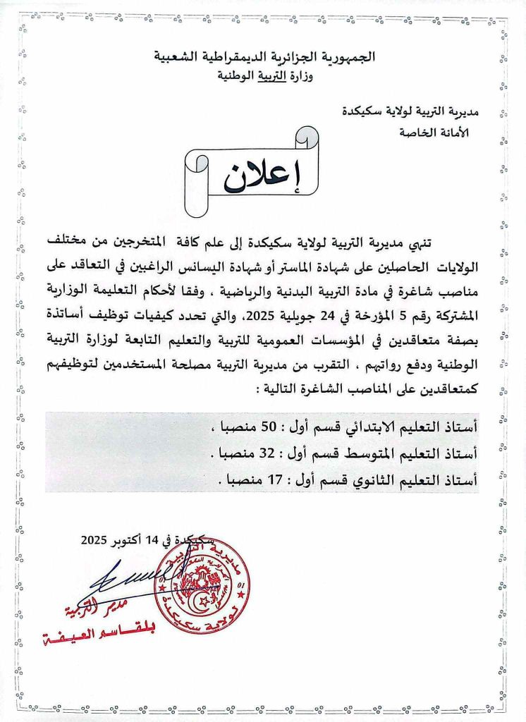 تنهي مديرية التربية لولاية سكيكدة إلى علم كافة المتخرجين من مختلف الولايات الحاصلين على شهادة الماستر أو شهادة الليسانس الراغبين في التعاقد على مناصب شاغرة في مادة التربية البدنية والرياضية، ووفقاً لأحكام التعليمة الوزارية المشتركة رقم 5 المؤرخة في 24 جويلية 2025، والتي تحدد كيفيات توظيف أساتذة بصفة متعاقدين في المؤسسات العمومية للتربية والتعليم التابعة لوزارة التربية الوطنية ودفع رواتبهم، التقرب من مديرية التربية مصلحة المستخدمين لتوظيفهم كمتعاقدين على المناصب الشاغرة التالية: