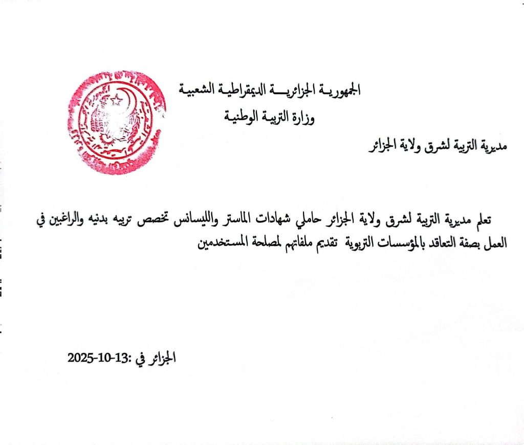 تُعلم مديرية التربية لشرق ولاية الجزائر حاملي شهادات الماستر والليسانس تخصص تربية بدنية والراغبين في العمل بصفة التعاقد بالمؤسسات التربوية تقديم ملفاتهم لمصلحة المستخدمين