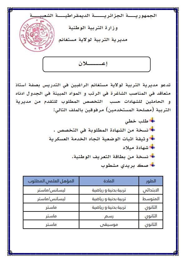 تدعو مديرية التربية لولاية مستغانم الراغبين في التدريس بصفة أستاذ متعاقد في المناصب الشاغرة في الرتب و المواد المبينة في الجدول أدناه والحاملين للشهادات حسب التخصص المطلوب للتقدم من مديرية التربية (مصلحة المستخدمين) مرفوقين بالملف التالي: