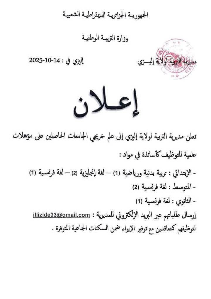 تعلن مديرية التربية لولاية إيليزي إلى علم خريجي الجامعات الحاصلين على مؤهلات