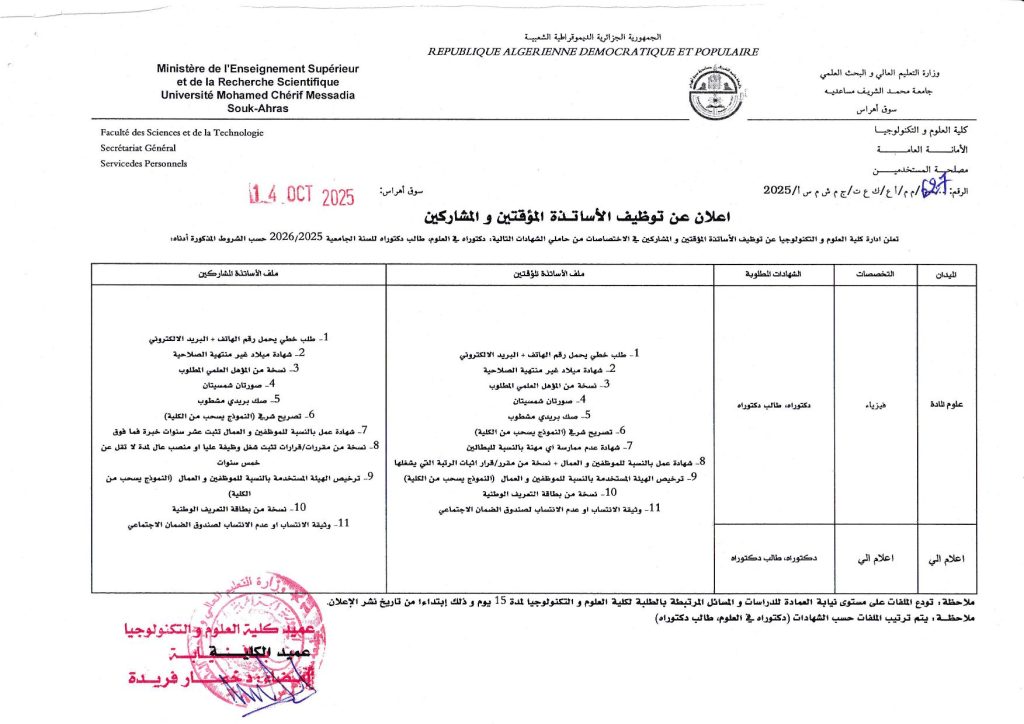تعلن إدارة كلية العلوم والتكنولوجيا عن توظيف الأساتذة المؤقتين و المشاركين في بعض التخصصات من حاملي الشهادات التالية: دكتوراه في العلوم، دكتوراه علوم للموسم الجامعي 2026/2025 حسب الشروط المذكورة أدناه: