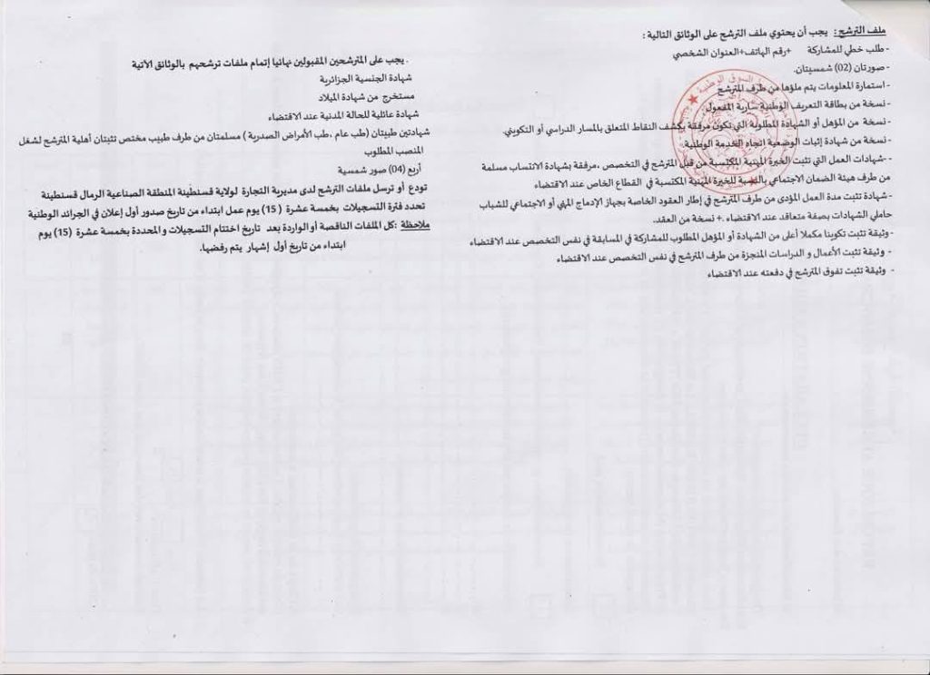 تودع أو ترسل ملفات الترشح لدى مديرية التجارة لولاية قسنطينة المنطقة الصناعية الرمال قسنطينة.