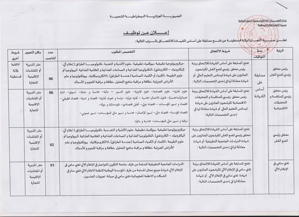 | محقق رئيسي لقمع الغش | مسابقة على أساس الشهادة | تفتح المسابقة على أساس الشهادة للالتحاق برتبة محقق رئيسي لقمع الغش المترشحون الحائزون على شهادة الدراسات الجامعية التطبيقية أو شهادة معادلة لها في إحدى التخصصات التالية: | ميكروبيولوجيا تطبيقية، بيوكيمياء تطبيقية، علوم الأغذية والتغذية، تكنولوجيا الطرائق (إعلام آلي – إلكترونيك – إلكتروتقني)، التكنولوجيا الغذائية والصناعات الغذائية والفلاحية الغذائية، البيولوجيا أو علوم الطبيعة، الكيمياء أو الكيمياء الصناعية (هندسة الطرائق)، الإلكتروميكانيك، بيوتكنولوجيا وعلم الأمراض الجزيئية، نظافة ومراقبة مناهج التحليل، نظافة ومراقبة اللحوم والأسماك. | 02 | مقر المديرية أو المفتشيات الإقليمية للتجارة | الإقامة ولاية قسنطينة |