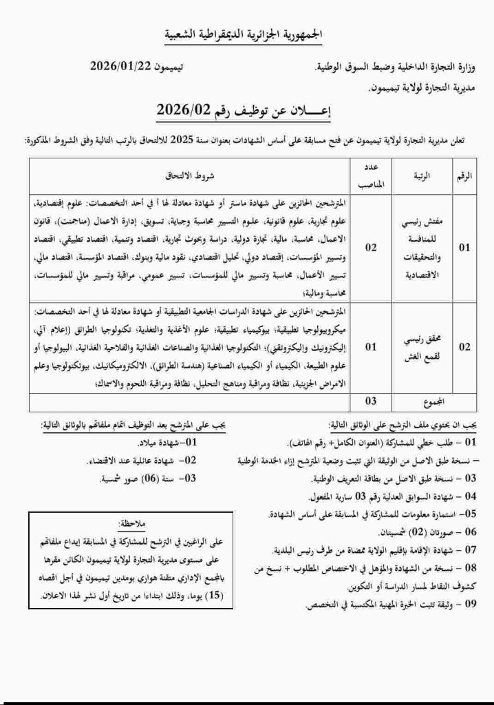 تعلن مديرية التجارة لولاية تيميمون عن فتح مسابقة على أساس الشهادات بعنوان سنة 2025 للالتحاق بالرتب التالية وفق الشروط المذكورة: