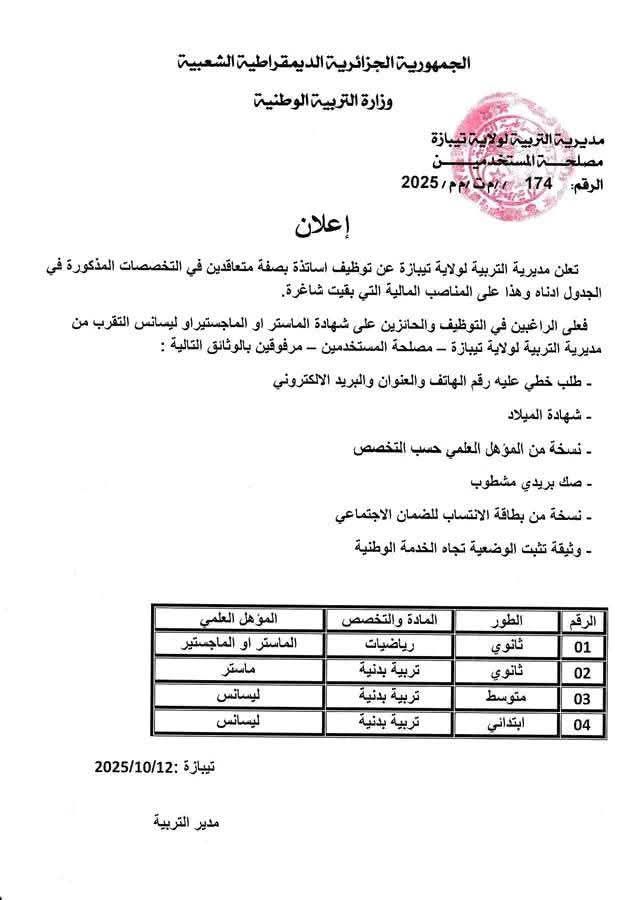 تعلن مديرية التربية لولاية تيبازة عن توظيف أساتذة بصفة متعاقدين في التخصصات المذكورة في الجدول أدناه وهذا على المناصب المالية التي بقيت شاغرة.
