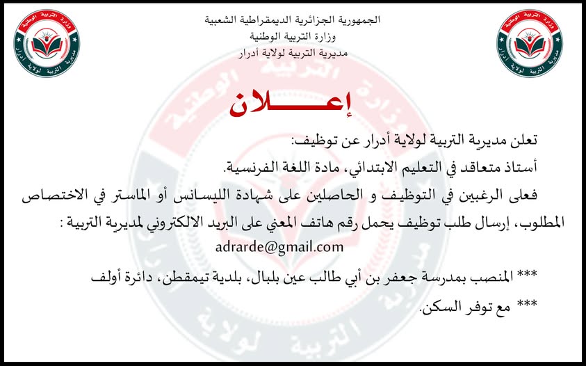 تعلن مديرية التربية لولاية أدرار عن توظيف:
