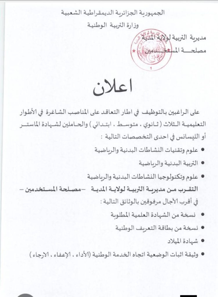 التقرب من مديرية التربية لولاية المدية — مصلحة المستخدمين — في أقرب الآجال مرفوقين بالوثائق التالية :