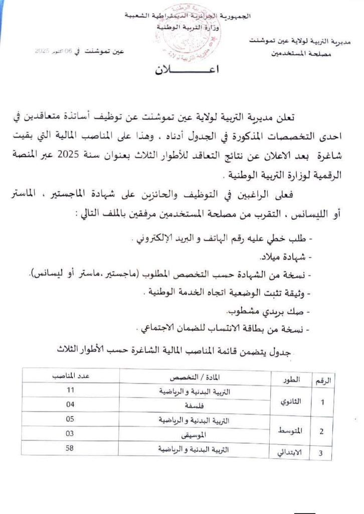 تعلن مديرية التربية لولاية عين تموشنت عن توظيف أساتذة متعاقدين في احدى التخصصات المذكورة في الجدول أدناه. وهذا على المناصب المالية التي بقيت شاغرة بعد الاعلان عن نتائج التعاقد للأطوار الثلاث بعنوان سنة 2025 عبر المنصة الرقمية لوزارة التربية الوطنية.