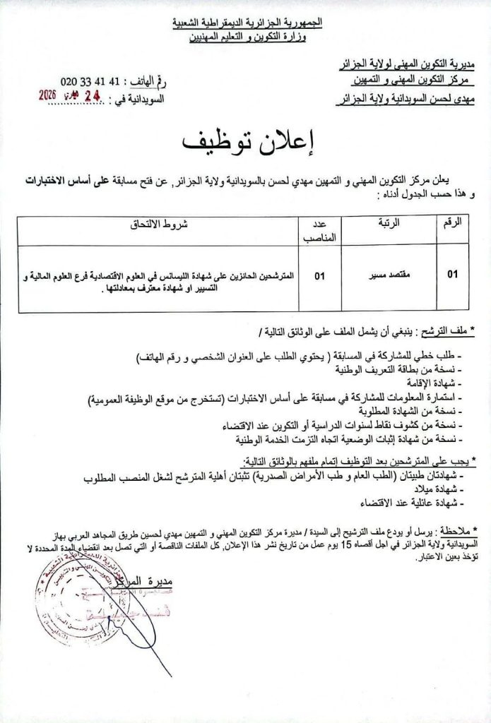 * ملاحظة: يرسل أو يودع ملف الترشيح إلى السيدة / مديرة مركز التكوين المهني والتمهين مهدي لحسن طريق المجاهد العربي بهاز السويدانية ولاية الجزائر في أجل أقصاه 15 يوم عمل من تاريخ نشر هذا الإعلان، كل الملفات الناقصة أو التي تصل بعد انقضاء المدة المحددة لا تؤخذ بعين الاعتبار.