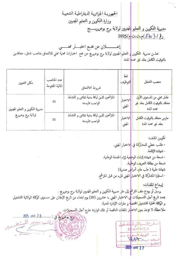 تعلن مديرية التكوين و التعليم المهنيين لولاية برج بوعريريج عن فتح إختبارات مهنية لائحاً للالتحاق بمناصب شغل ، متعاقدين بالتوقيت الكامل بعقد غير محدد المدة.
