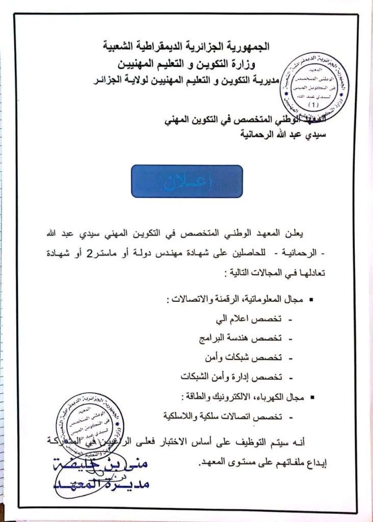 يعلن المعهد الوطني المتخصص في التكوين المهني سيدي عبد الله – الرحمانية – للحاصلين على شهادة مهندس دولة أو ماستر 2 أو شهادة تعادلها في المجالات التالية: