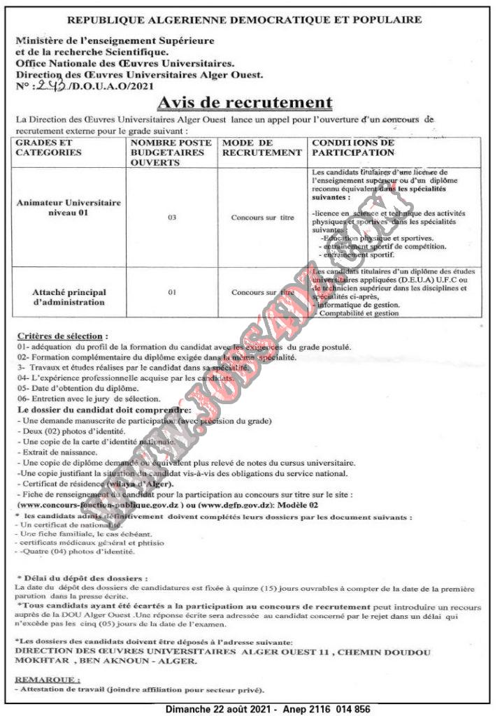 تعلن مديرية الخدمات الجامعية جزائر غرب عن فتح توظيف خارجي على اساس الشهادة في المناصب التالية