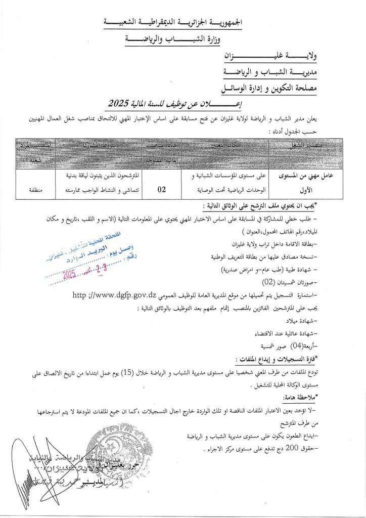 يعلن مدير الشباب و الرياضة لولاية غليزان عن فتح مسابقة على أساس الإختبار المهني للإلتحاق بمناصب شغل العمال المهنيين حسب الجدول أدناه: