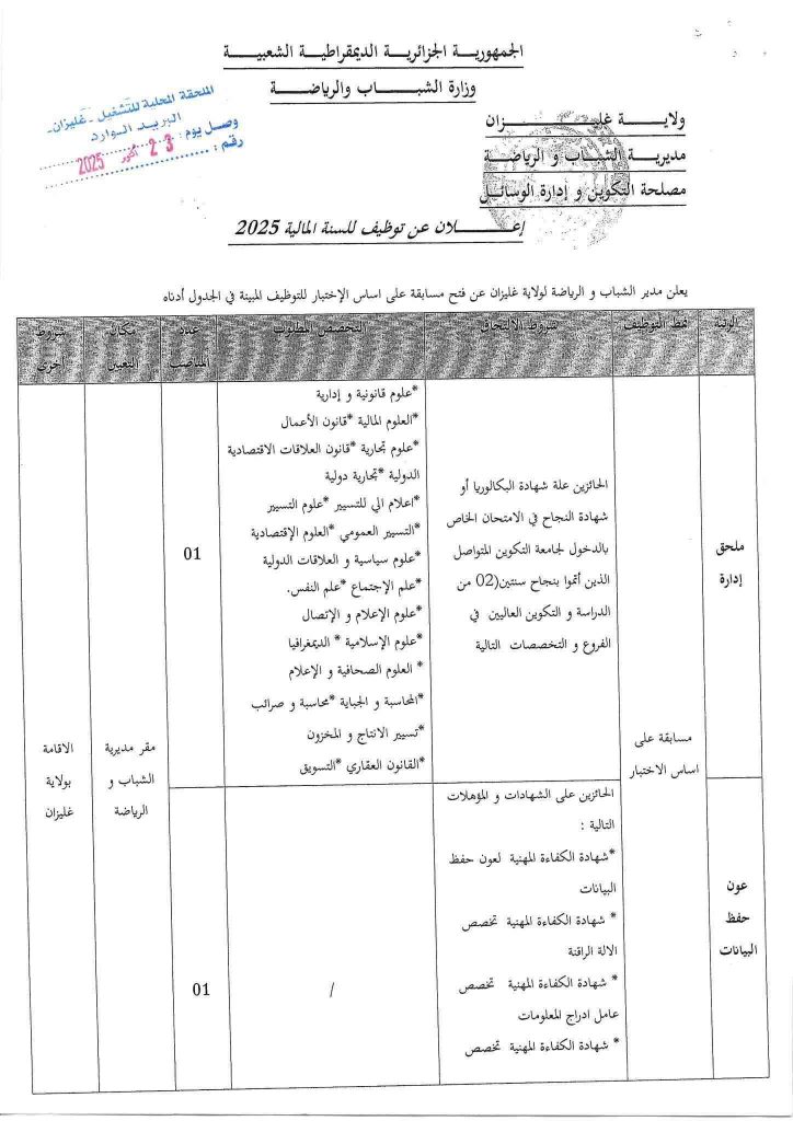 | ملحق إدارة | مسابقة على أساس الإختبار | الحائزين على شهادة البكالوريا أو شهادة النجاح في الإمتحان الخاص بالدخول لمؤسسات التكوين المتواصل الذين أتموا بنجاح سنتين (02) من الدراسة و التكوين العاليين في الفروع و التخصصات التالية: *علوم قانونية و إدارية *العلوم المالية *قانون الأعمال *علوم تجارية *قانون العلاقات الاقتصادية الدولية *تجارة دولية *إعلام آلي للتسيير *علوم التسيير *التسيير العمومي *العلوم الاقتصادية *علوم سياسية و العلاقات الدولية *علم الإجتماع *علم النفس *علوم الإعلام و الإتصال *علوم الإسلامية *الديمغرافيا *العلوم الصحافية و الإعلام *المحاسبة و الجباية *محاسبة و ضرائب *تسيير الإنتاج و المخزون *القانون العقاري *التسويق | 01 | مقر مديرية الشباب و الرياضة | الإقامة بولاية غليزان |