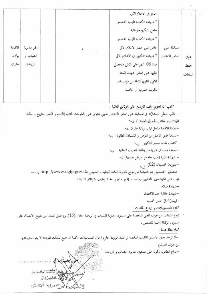 | عون حفظ البيانات | مسابقة على أساس الإختبار | الحائزين على الشهادات و المؤهلات التالية: *شهادة الكفاءة المهنية لعون حفظ البيانات *شهادة الكفاءة المهنية تخصص عامل الميكرو معلوماتية *شهادة الكفاءة المهنية تخصص عامل إدراج المعلومات *شهادة الكفاءة المهنية تخصص حجز في الإعلام الآلي *شهادة الكفاءة المهنية تخصص عامل الميكرومعلوماتية *شهادة الكفاءة المهنية تخصص عامل على جهاز الإعلام الآلي *شهادة التكوين في الإعلام الآلي مدة 06 أشهر على الأقل متحصل عليها على أساس شهادة السنة الأولى ثانوي كاملة من مؤسسات تكوينية عمومية أو خاصة | 01 | مقر مديرية الشباب و الرياضة | الإقامة بولاية غليزان |