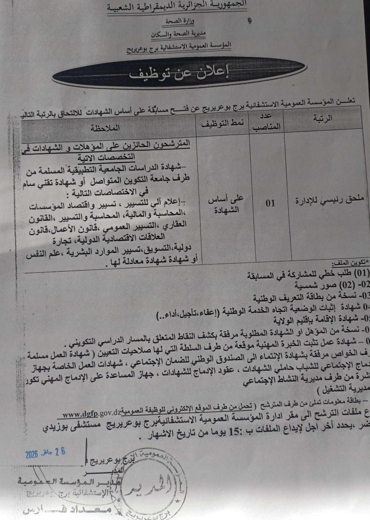 تعلن المؤسسة العمومية الاستشفائية برج بوعريريج عن فتح مسابقة على أساس الشهادات للالتحاق بالرتبة التالية: