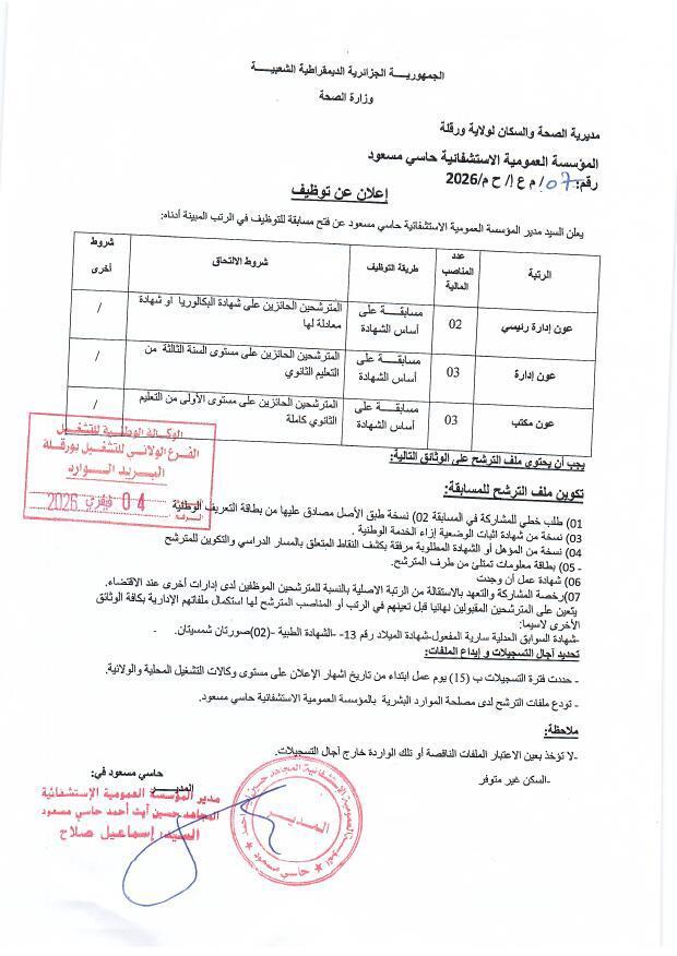 يعلن السيد مدير المؤسسة العمومية الاستشفائية حاسي مسعود عن فتح مسابقة للتوظيف في الرتب المبينة أدناه: