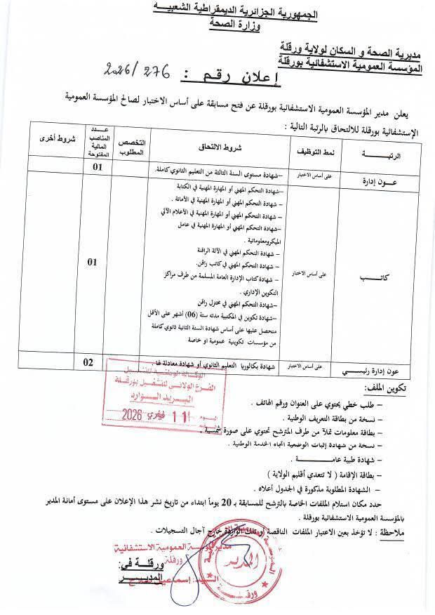 يعلن مدير المؤسسة العمومية الاستشفائية بورقلة عن فتح مسابقة على أساس الاختبار لصالح المؤسسة العمومية الاستشفائية بورقلة للالتحاق بالرتب التالية: