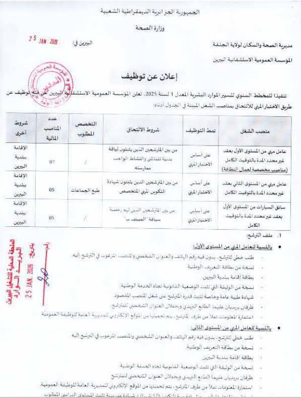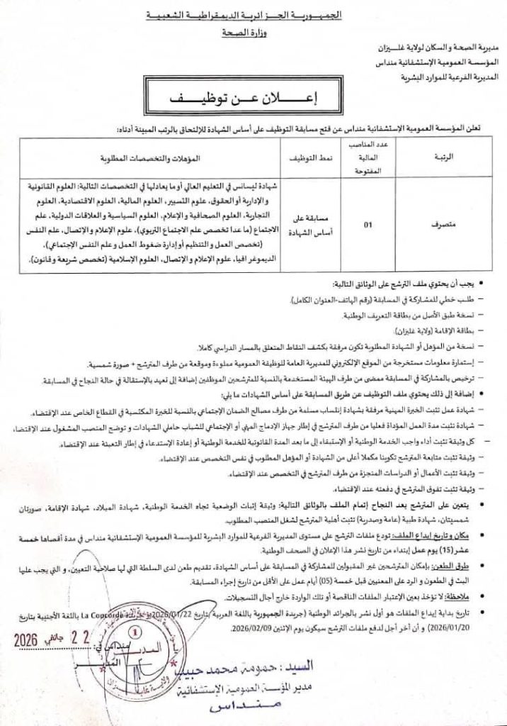 تعلن المؤسسة العمومية الاستشفائية منداس عن فتح مسابقة التوظيف على أساس الشهادة للالتحاق بالرتب المبينة أدناه: