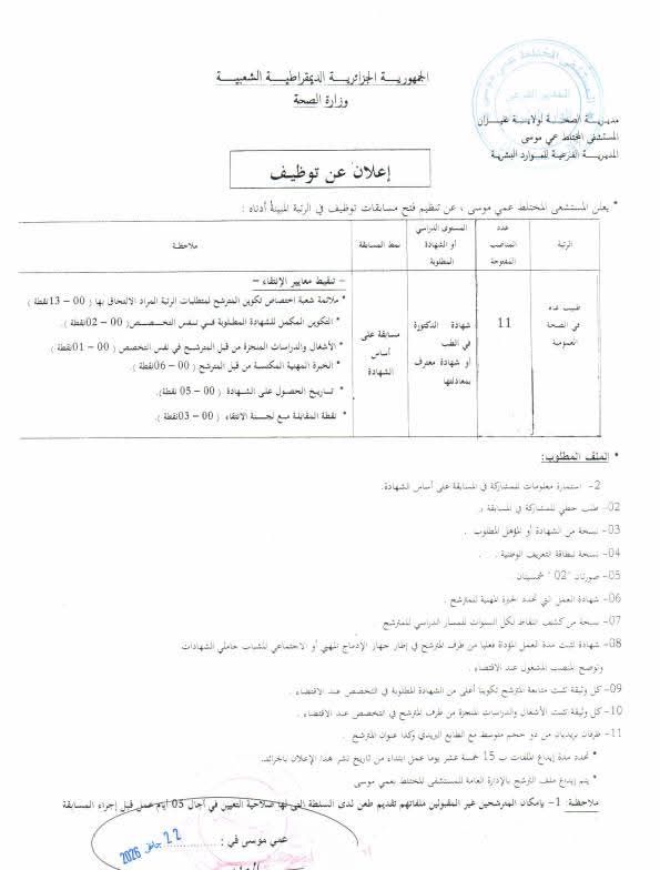 يعلن المستشفى المختلط عمي موسى، عن تنظيم فتح مسابقات توظيف في الرتبة المبينة أدناه: