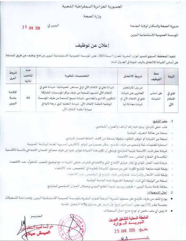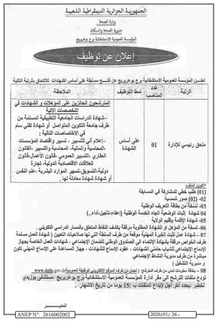 تعلن المؤسسة العمومية الاستشفائية برج بوعريريج عن فتح مسابقة على أساس الشهادات للالتحاق بالرتبة التالية: