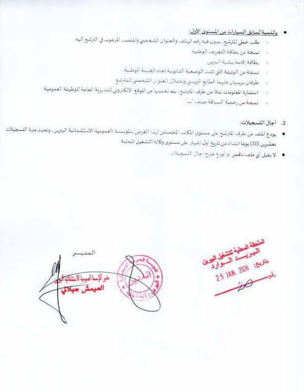 - تاريخ بداية إيداع الملفات: هو أول نشر بالجرائد الوطنية (جريدة الجمهورية باللغة العربية بتاريخ 2026/01/22 وجريدة La Concorde باللغة الأجنبية بتاريخ 2026/01/20) وأن آخر أجل لدفع ملفات الترشح سيكون يوم الإثنين 2026/02/09.